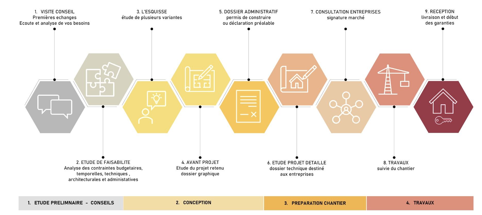 L’architecte vous signale les démarches à effectuer en parallèle: étude complémentaire, les démarches administratives à prévoir et vous renseigne concernant le choix des produits et matériaux (showroom, catalogues, etc..).